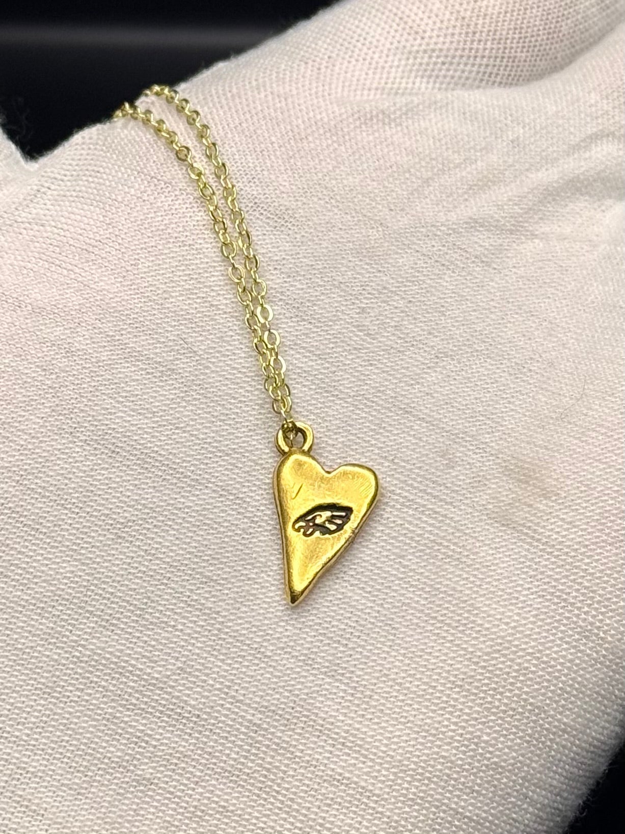 Bring a warm, vintage glow to your game day look. This petite heart-shaped pendant is finished in antique 18K gold fill and features the Eagles logo, engraved and hand-enameled for a subtle but unmistakable nod to your team. Perfect for layering or wearing solo, it’s a timeless piece that blends sporty pride with heirloom vibes.