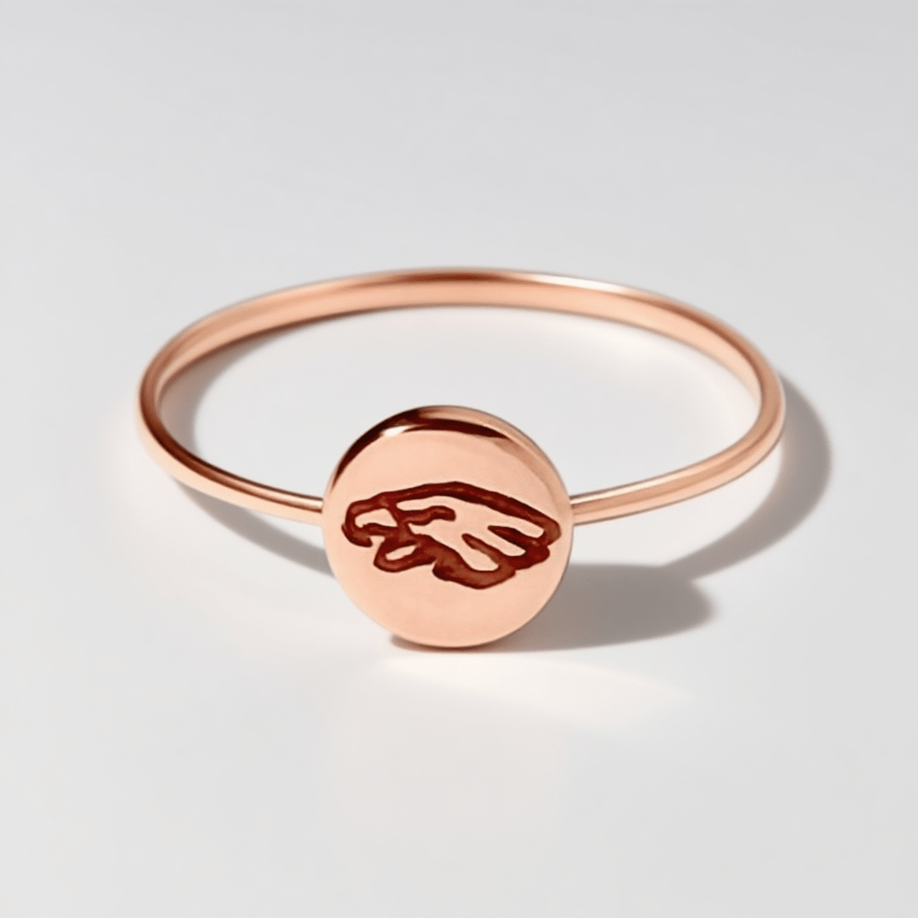 A golden take on a Philly favorite. This hand-soldered ring features a 6mm round face engraved with the Eagles logo, crafted in rode gold-filled .925 sterling silver for a luxe yet durable finish. The simple 20-gauge band keeps it lightweight and comfortable, making it perfect for everyday wear or game-day stacking.