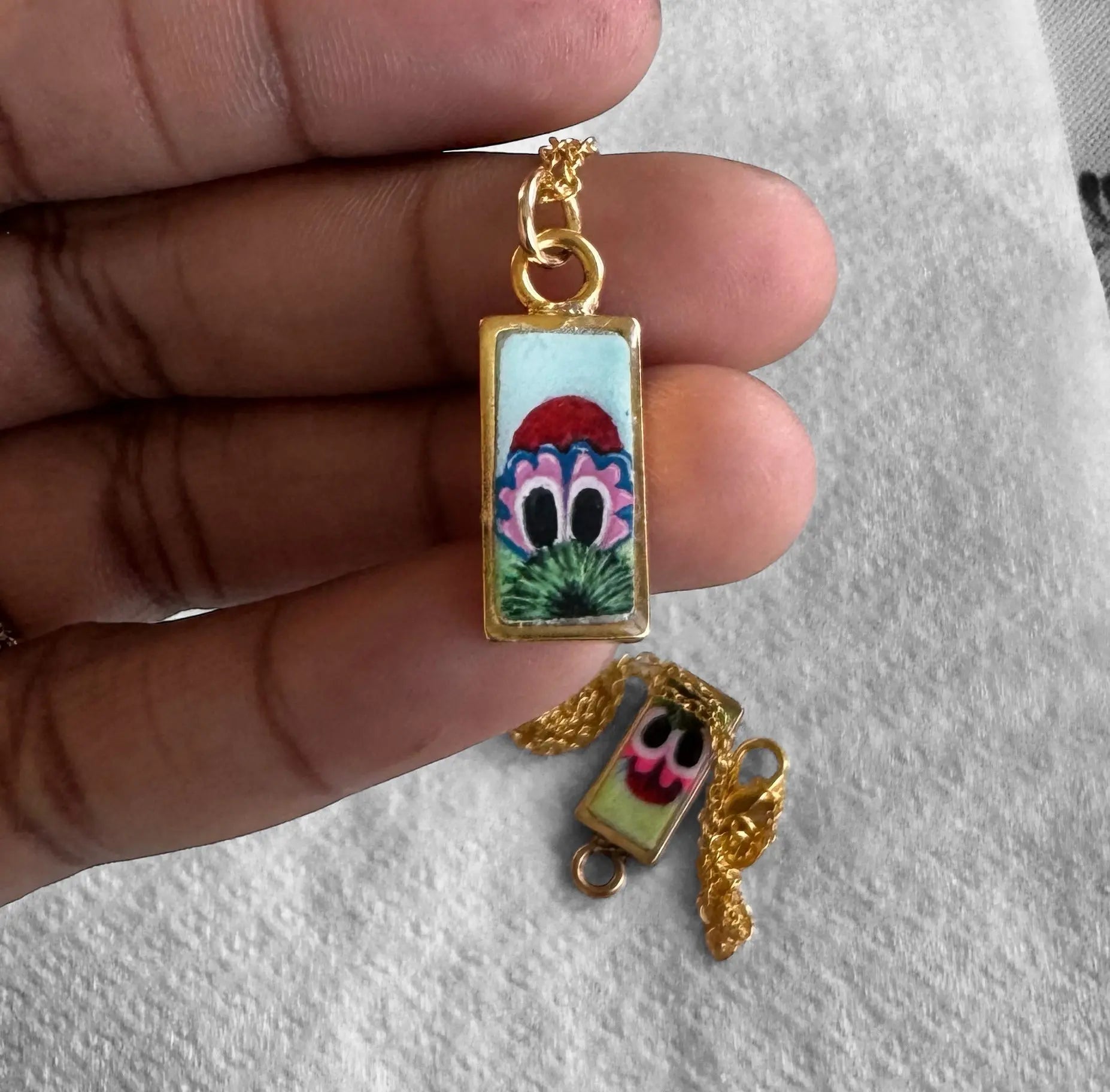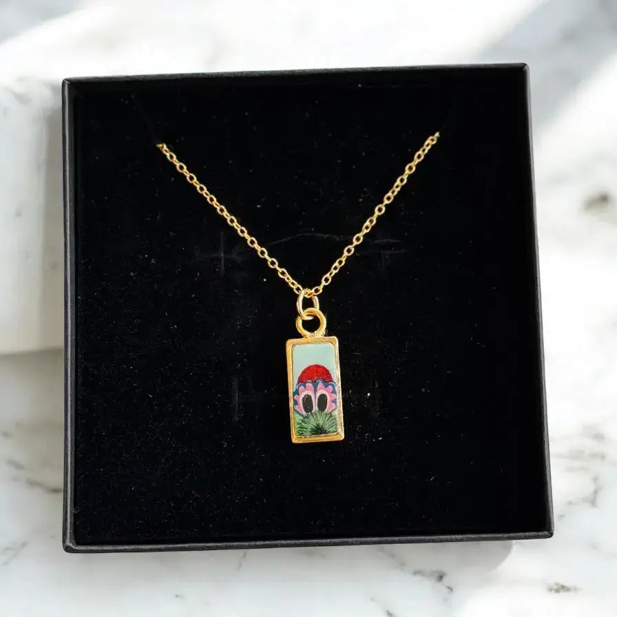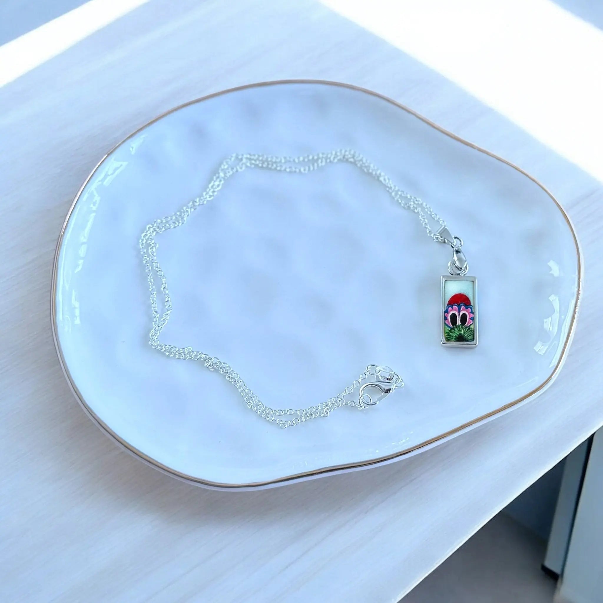 A blink-and-you’ll-miss-it peek of Philly’s favorite chaos creature. This miniature 10x20mm pendant is hand-painted with high-quality gouache and sealed in glossy resin for a bold, durable finish. Strung on a 18-inch sterling silver plated chain (can be ungraded to solid Sterling silver) keeps it close to your heart—right where it belongs.