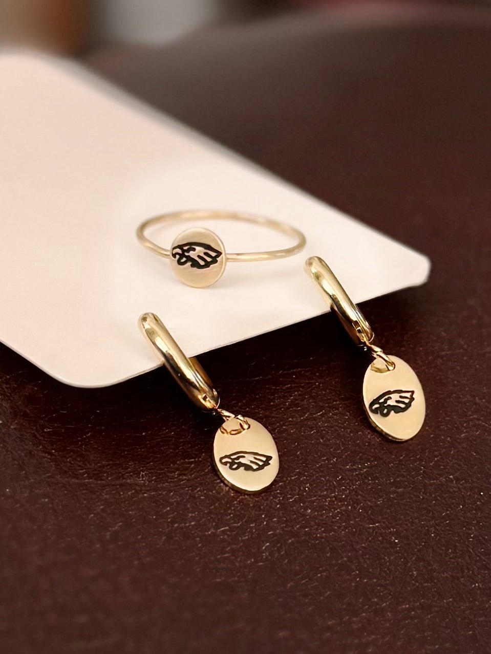 A golden take on a Philly favorite. This hand-soldered ring features a 6mm round face engraved with the Eagles logo, crafted in 14K gold-filled .925 sterling silver for a luxe yet durable finish. The simple 20-gauge band keeps it lightweight and comfortable, making it perfect for everyday wear or game-day stacking.