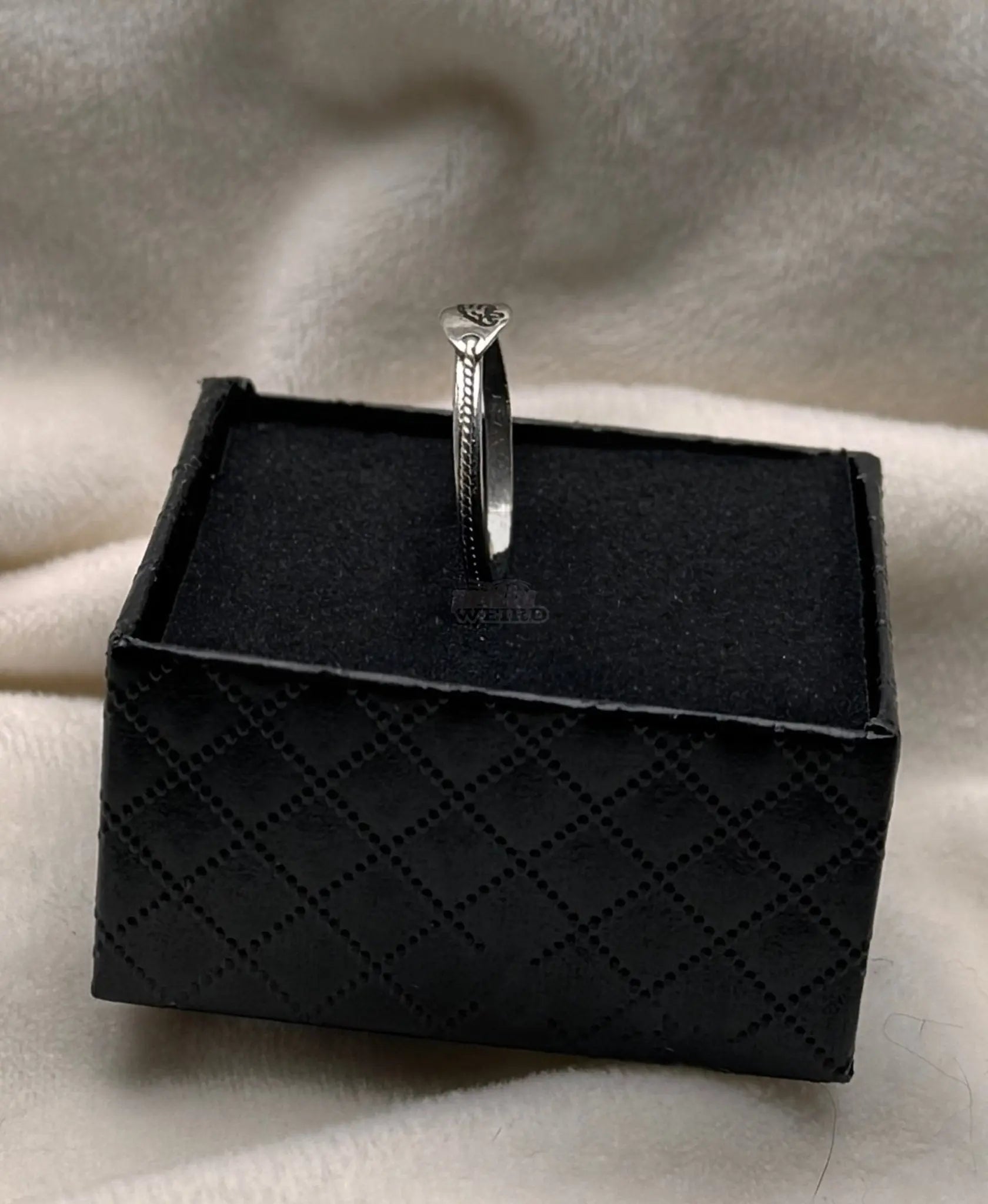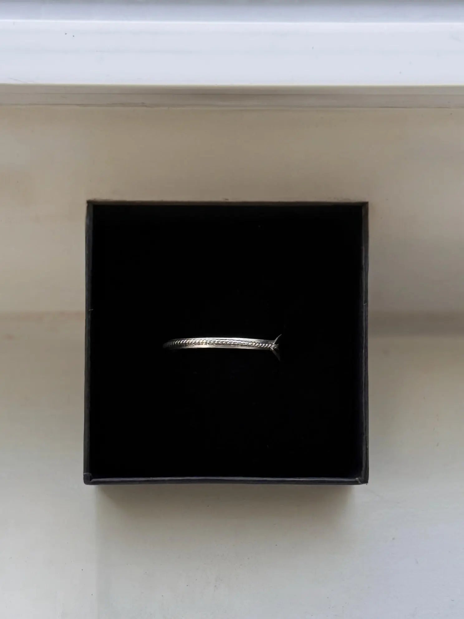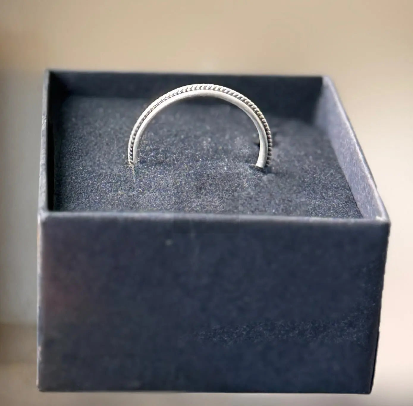 - Detailed band with twisted-edge overlay on a flat sterling base