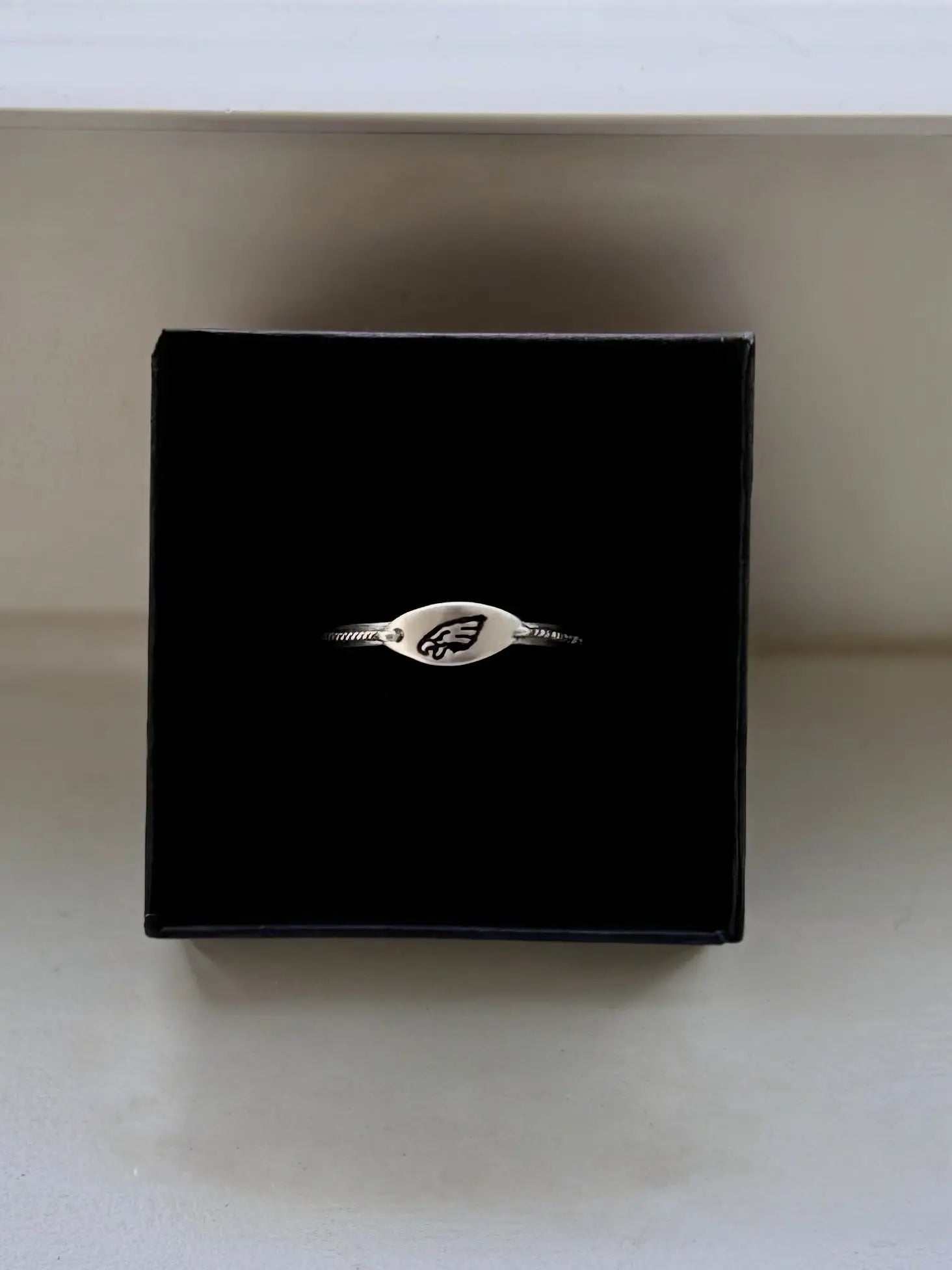 A refined take on fan jewelry, the Marquise-shaped Eagles Crest Ring pairs subtle team pride with elevated design. The center features a hand-engraved Eagles logo set in a sleek marquee shape, polished to a soft glow. It rests on a sculptural sterling silver band with delicate rope detailing layered over a solid flat base—bringing texture, contrast, and structure to a minimal silhouette.